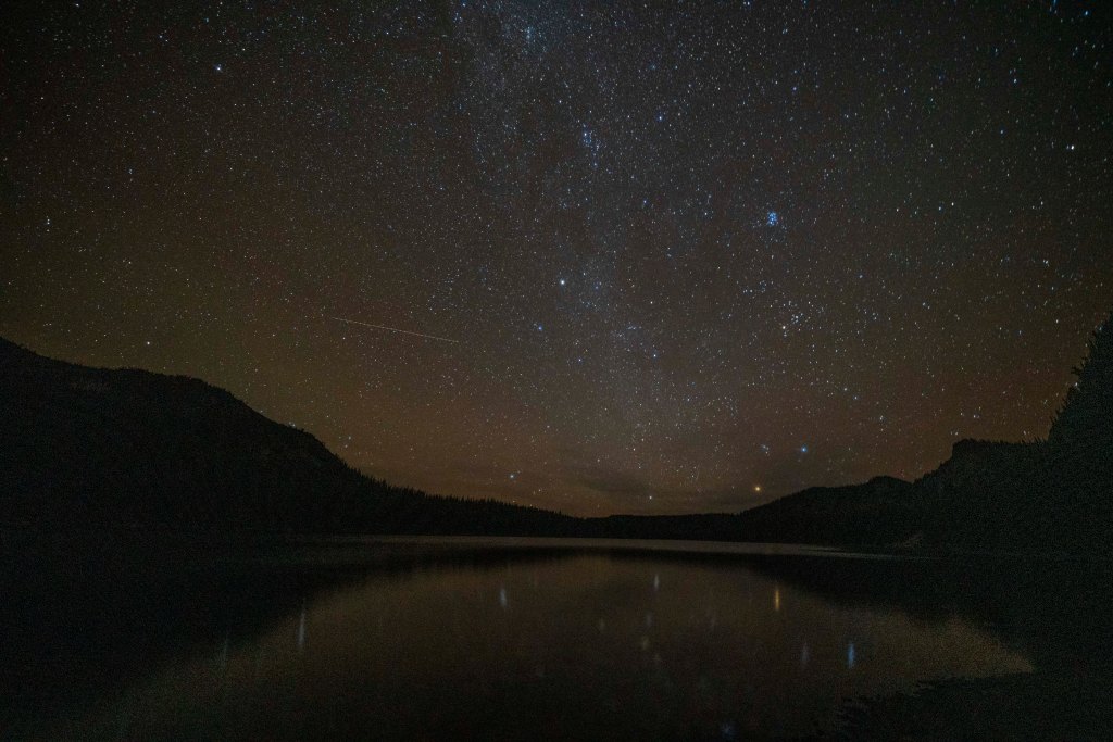 Here is the same image with a different exposure. I do love the star reflections in the lake. Also notice the streak near mid image! Any guesses on what that might be???? (answer at the end of this post)