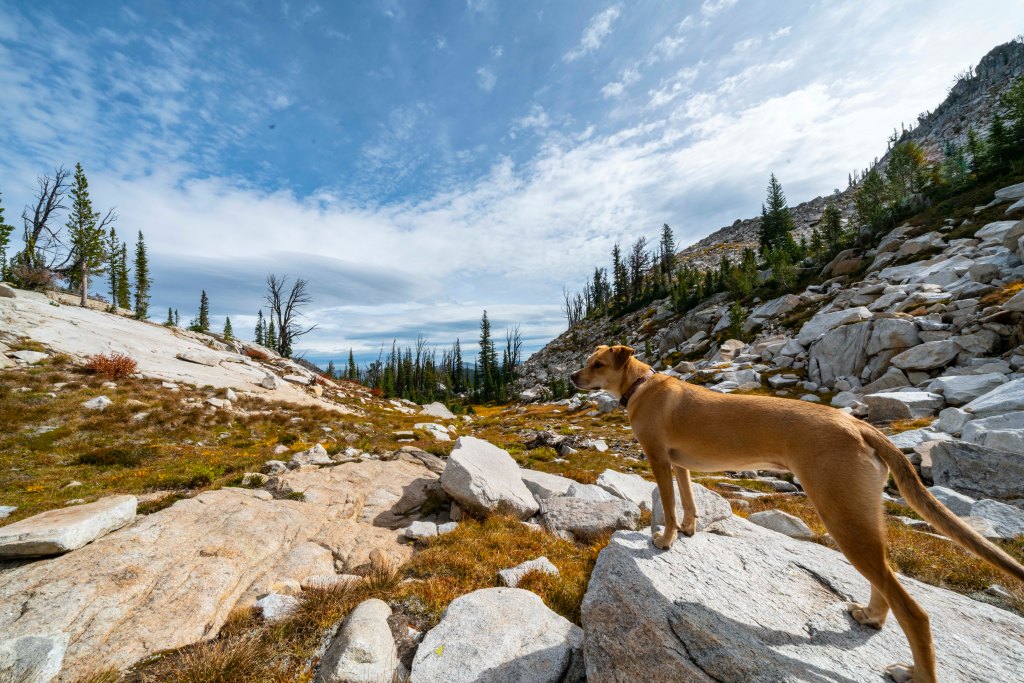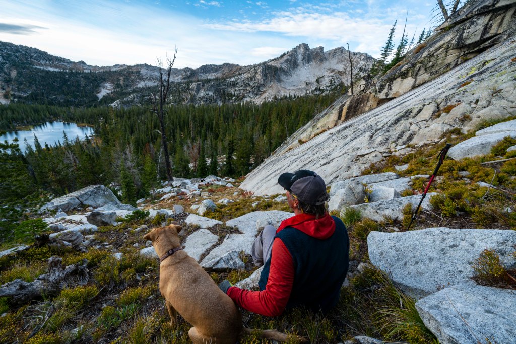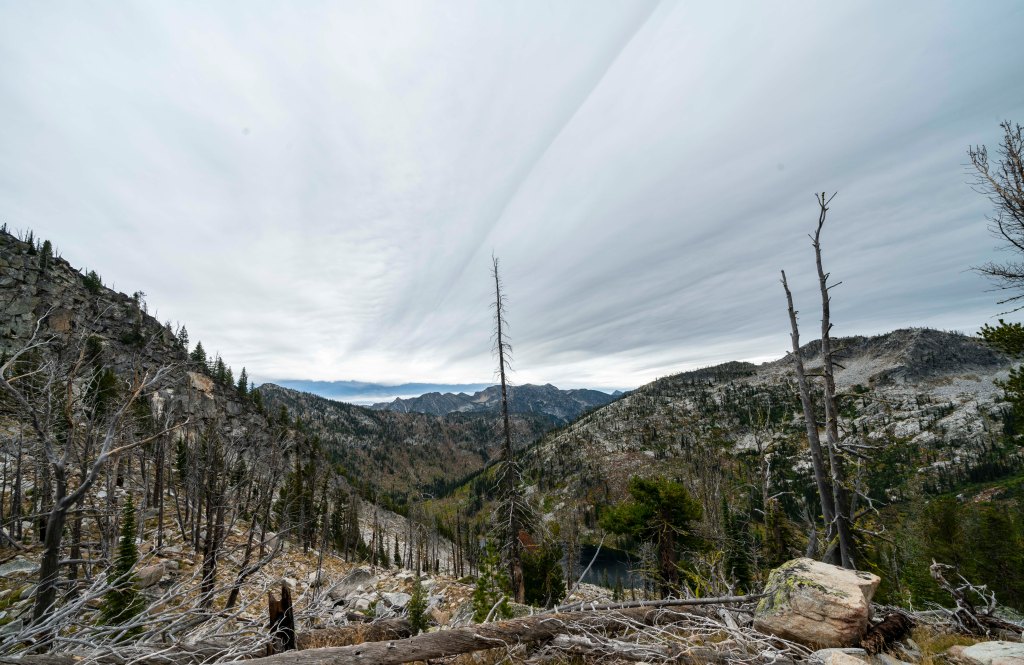 Finally, a look down into the Hum Lake Basin, perhaps the happiest place on earth for Nicole! A quick note here on the dead trees which frequently appear in my blog. Interestingly enough, one of my most asked questions is: “Why all the dead trees” Is this normal?” Thanks Mikey and Nemorino! Dead trees here are part of the natural vegetative cycle for the high country. Life is tough up here. Generally, you see older trees like in this image that simply die of old age, the younger trees are quick to replace them. On steeper slopes, the avalanches wipe out older trees. Perhaps the most common cause is fire. Many of our forests in Idaho are Lodgepole Pines and they have a very rapid burn cycle. In fact, these forests need to burn every few decades to regenerate new trees. The lodge pole fires burn all the limbs and leave…..standing lodge poles. It takes them years for the bases to rot and then fall, which then creates our favorite hiking experience…. Downfall! One other thing, I think dead trees are interesting to photograph so you probably see an abnormally large number on this blog. Thanks for asking!!!!