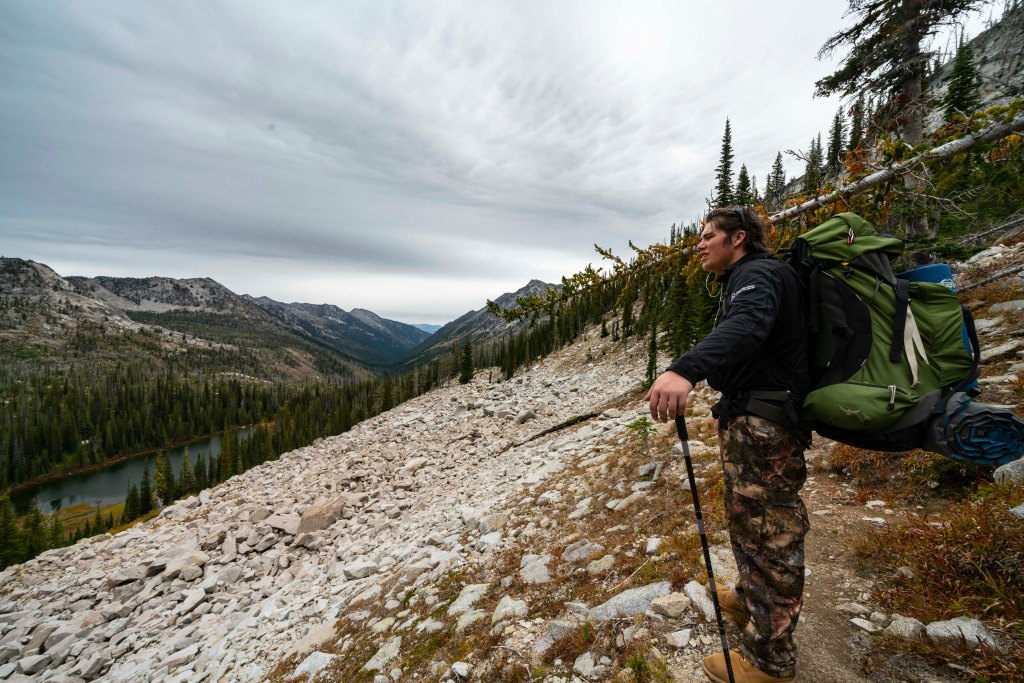 Mikey near the top of Hum Saddle #2 looking down on Haw Lake and the upper Loon Creek Basin. You might be confused thinking he is a floating torso with a backpack, actually it is an optical illusion, he is wearing his new favorite pants, redneck Idaho style, camouflage!