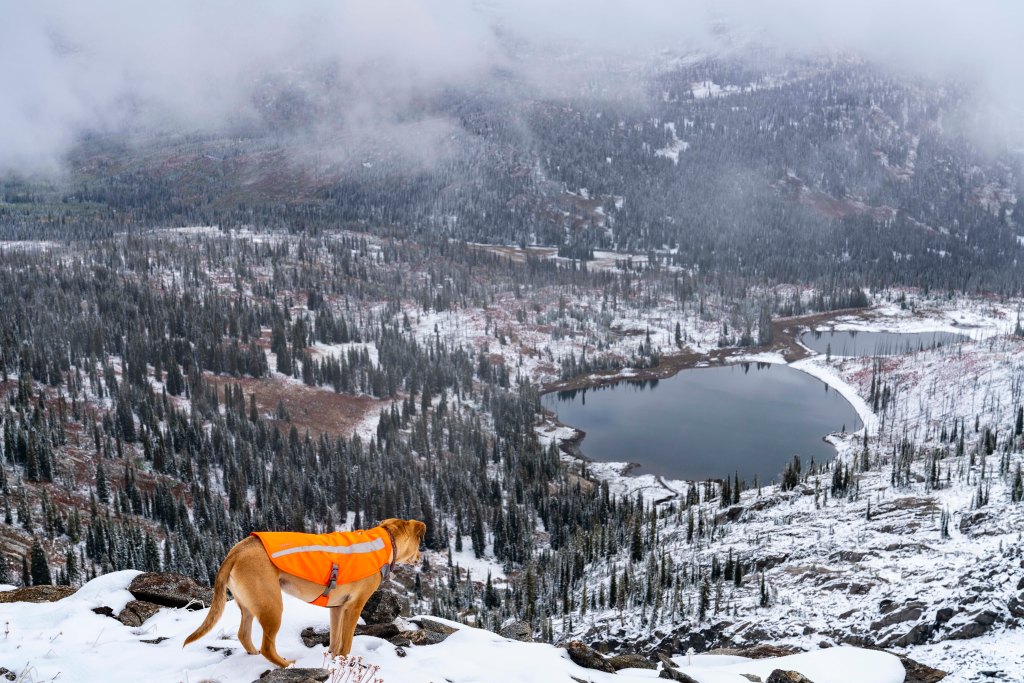 Ruby looking down on Twin Lakes. Its hunting season so she is sporting her fall fashion line.