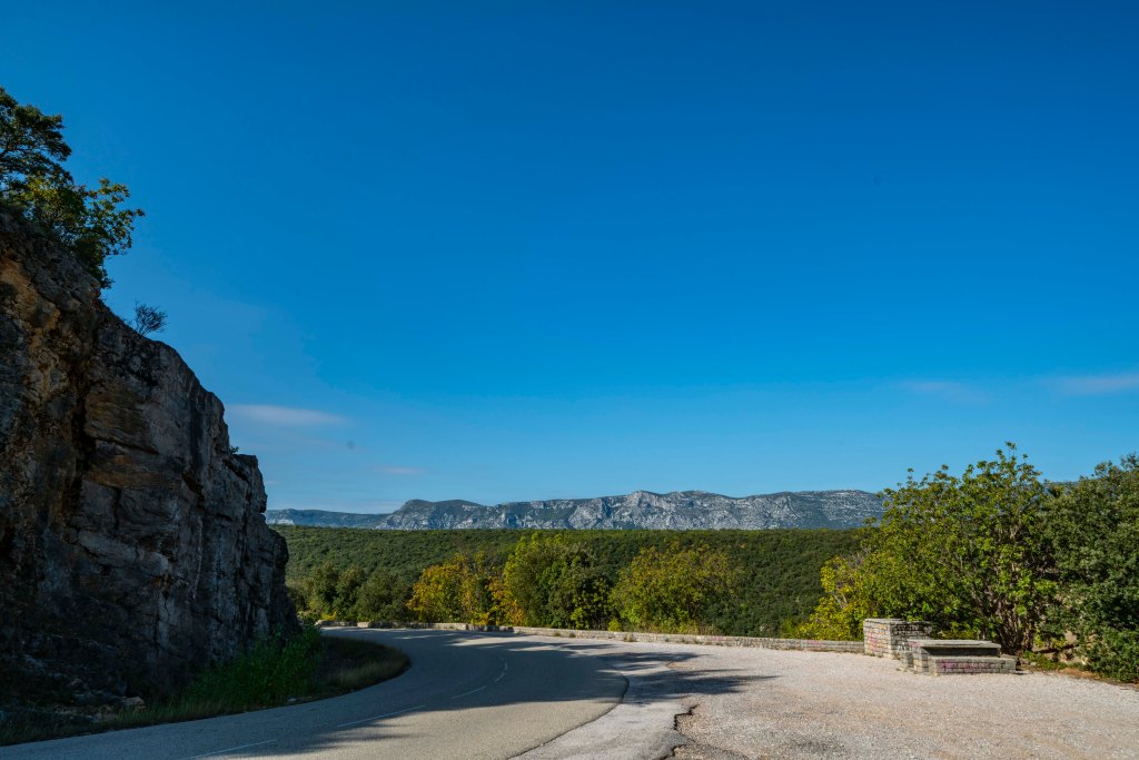 Road picture intermission. We actually rode between the gap off in the distance, the peak on the right is Pic Saint-Loup.. The wide angle lens does not do it justice as the top is at about 2200 feet of elevation and rises about 1500 feet above the surroundings. Its a popular hiking area but also with the gentle winds and wonderful Saturday afternoon, a bunch of gliders and para-sailors were swirling above.