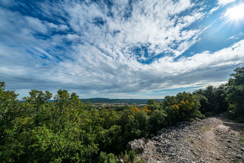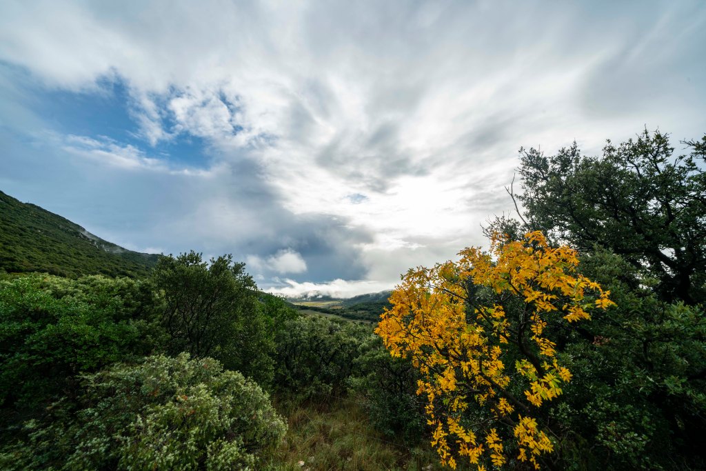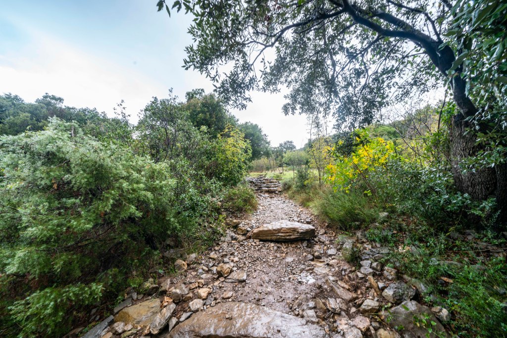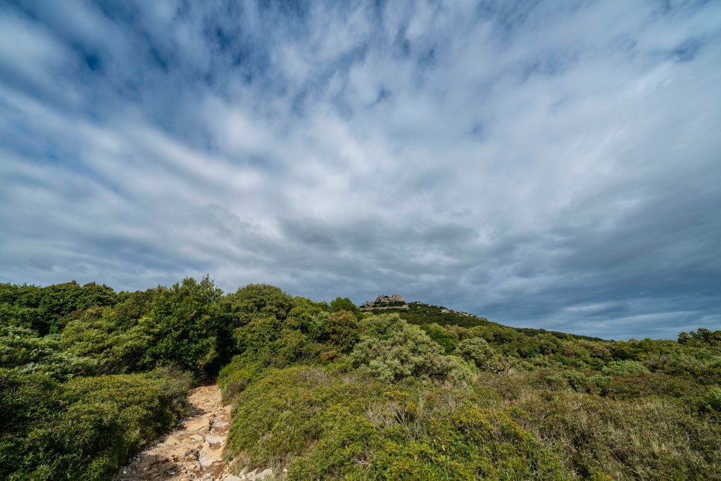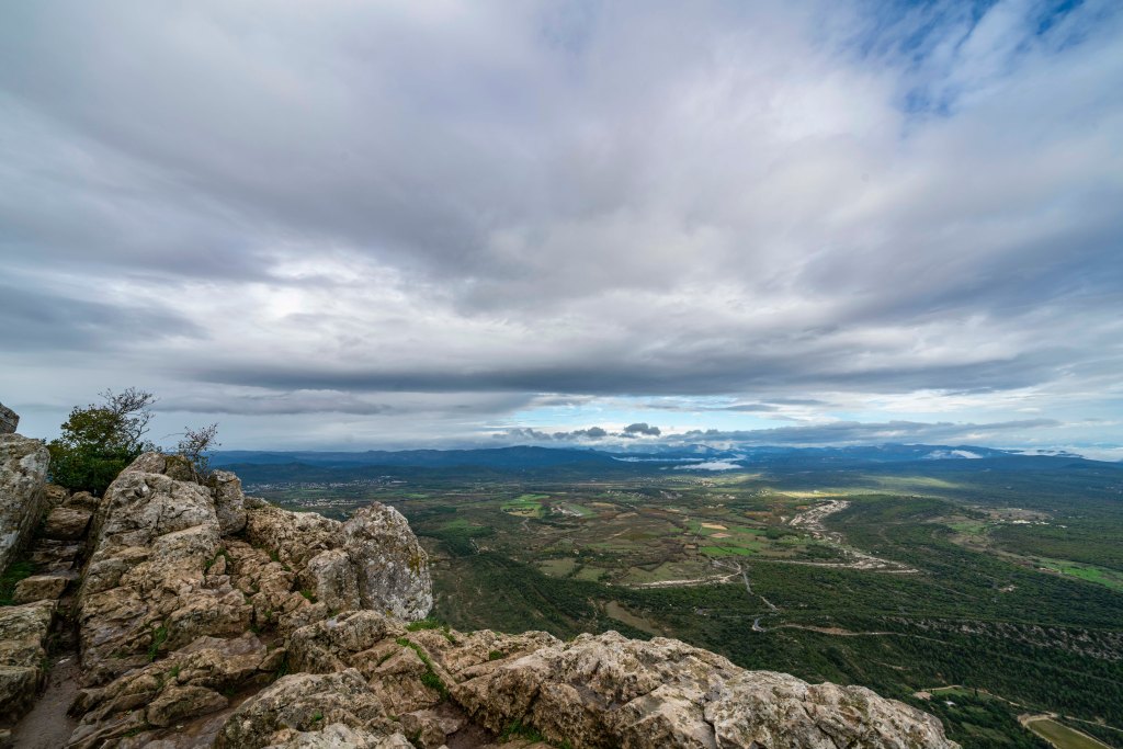 Pic Saint Loup is a peak that dominates the views in this little valley so of course Nicole and I had to climb it before she left. The day started off with a 20 minute taxi ride to the trailhead in Cazevielle. The forecast called for showers starting about 1:00 so we got an early start. The moment we jumped in the taxi, the skies opened up and it poured for the entire 20 minute ride. We debated the entire way about what our alternative plan might be….. walk the road back? will it be muddy? will there be lightning? this is crazy right? The taxi dropped us off in what where now showers, we were committed. Pic Saint Loup is the one on the right.