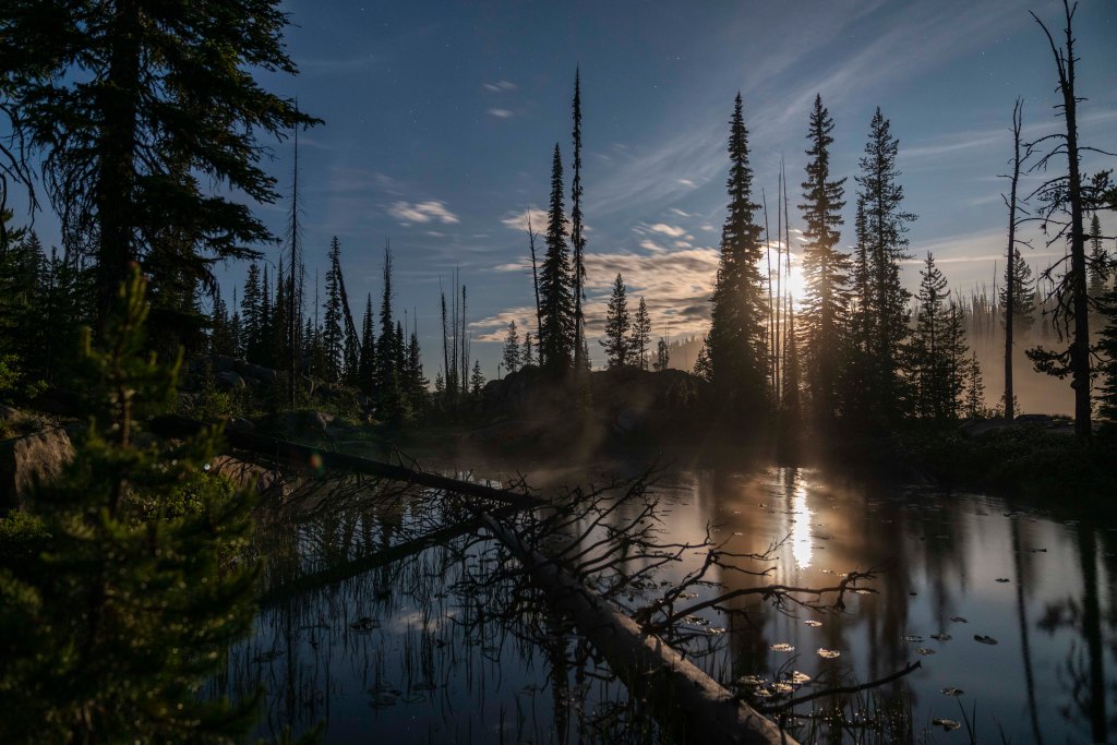On one morning in early July, I woke up early, and by early, I mean about 3:00 am. Feeling motivated to get some low light photography, I headed up Lick Creek Road to perhaps my favorite and most familiar place for photography, Summit Lake. Getting low light photography here in early July is a challenge since it is so close to the summer solace and this far north it never gets totally dark for long. On this particular morning, I captured some of my best images of the year. Keep in mind that this moon set image used a very slow shutter speed and that it was actually quite dark. The mist, combined with the full moon and the nearby howling wolfs made the hair on the back of my neck stand on end….. I pressed on in the name of art!!!