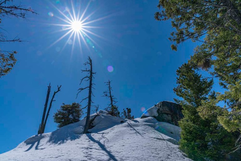 After about an hour of hiking up a ridge, we hit continuous snow. It was time for snowshoes!