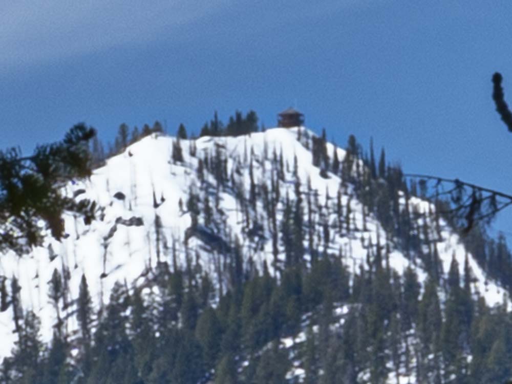 Here is an extreme digital zoom (sorry for the blur) of the peak through the trees so you can see the fire lookout on top of Miner’s Peak.