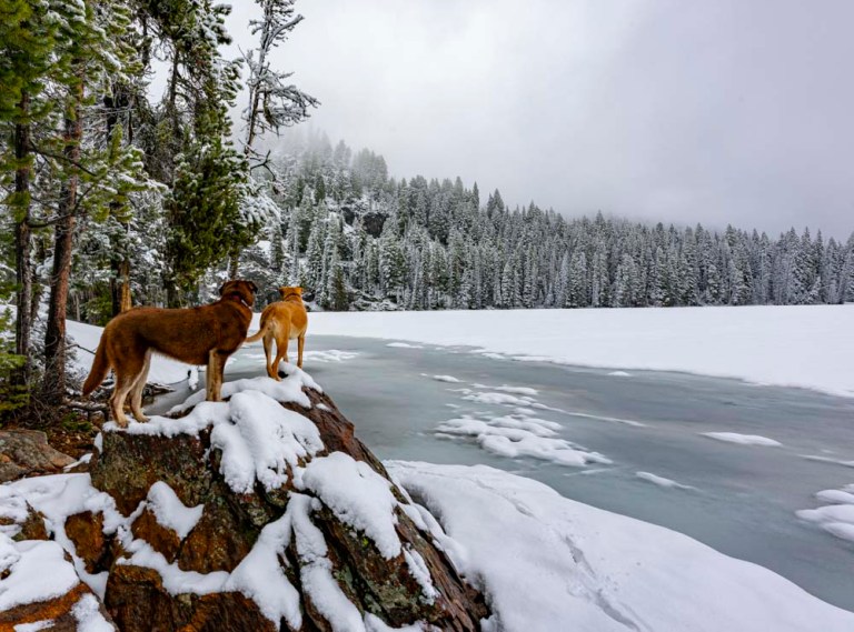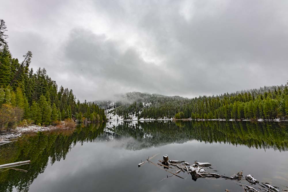 This morning, a small break in the rain allowed John, Craig, Ruby, Dakota and I to sneak out for one of our neighborhood specials! We call these neighborhood hikes because they are within a few minutes drive of home and are not super long…..generally less than 5 miles total. Other examples would be Jigsaw, Snowdon, and Goose Creek Falls. Upper and Lower Boulder Lake are destinations I have been many times but each time the season is different as are the weather conditions. Check out some of my previous visits here: https://davefaitlemonde.com/2018/09/23/boulder-lake-valley-county-idaho/ https://davefaitlemonde.com/2018/10/09/boulder-louie-lake-loop-with-a-twin-peak-summit/ https://davefaitlemonde.com/2019/10/16/vics-peak-rapid-peak-and-buckhorn-mountain-valley-county-idaho/ We parked near Lower Boulder Lake and headed along the east shore (left side) towards the inlet.