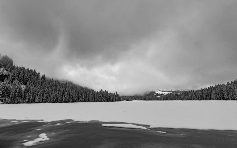 An increasingly less rare black and white image on davefaitlemonde.com. Upper Boulder Lake.