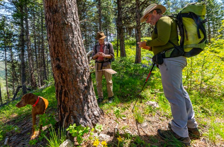 We found this artifact stuck in a tree. It’s an old rusted buck saw right along the route of the old trail. Was it from the original trail days or from a fire fighting crew that came in years later? John and Art are so excited to put data into their GPS devices that they look like millennials texting their friends. River just can’t figure out why we stopped! By the way, no cell service here or anywhere near here!