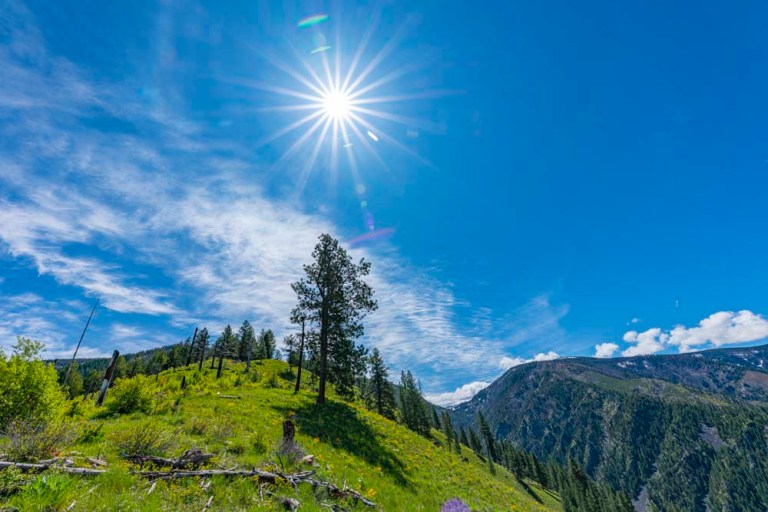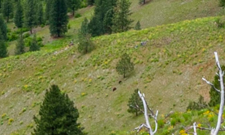 Well probably not in that image! I had been using my 14mm wide angle lens all day and since my longer lens was back at the cabin, I had almost no chance to shoot them. However, this is an extreme digital zoom of the same image… the two dots under the tree are the bears. Why was my longer lens at the cabin? Well, did I mention the 4000 vertical feet, that and the fact that there were no water sources on the ridge? On this hot day, all extra weight allocation was meant used for carrying lots of water.