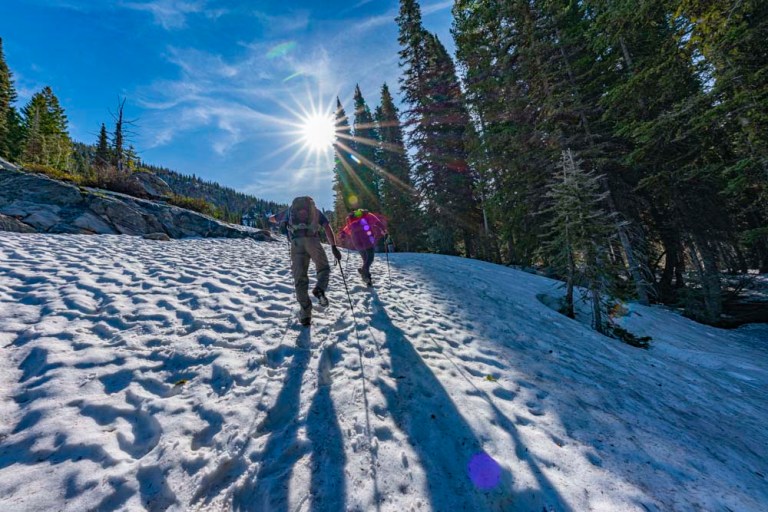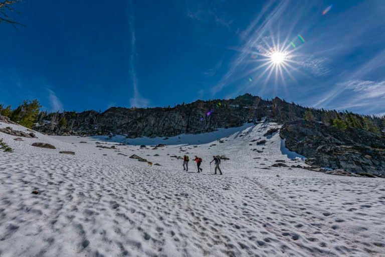 After climbing for about an hour, we hit continuous snow. If the climb to Golden Lake looks steep…..it is!