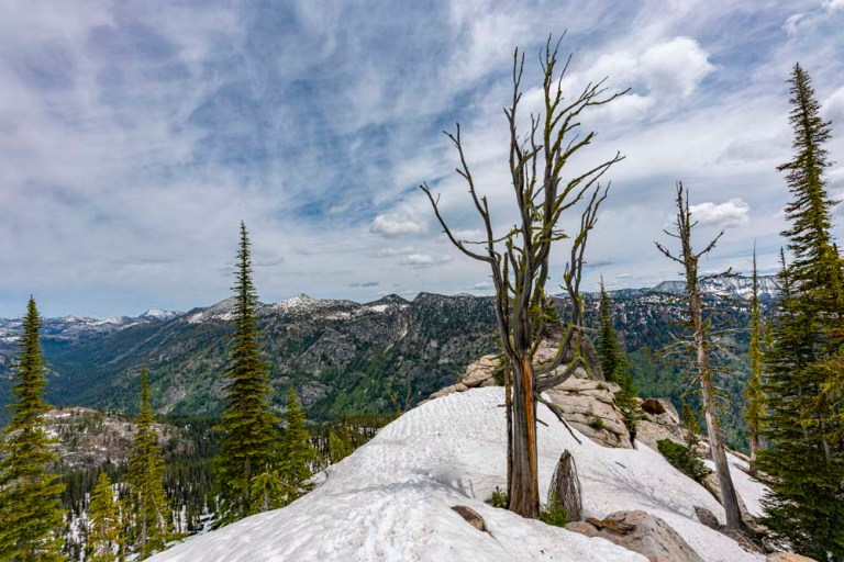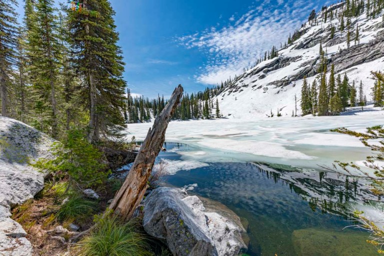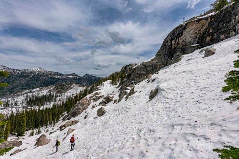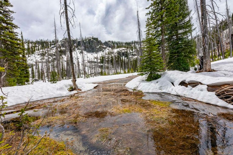 Gradually working our way up Lick Creek as the snow melts towards the summit. See John’s trip report here: http://www.splattski.com/2020/pk7828/index.html John wanted to take us up a non-traditional route to Crystal Lake. It was a little “spicy!” as John likes to say but Nicole loved it!