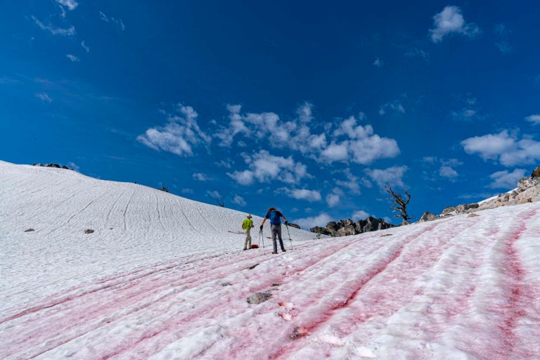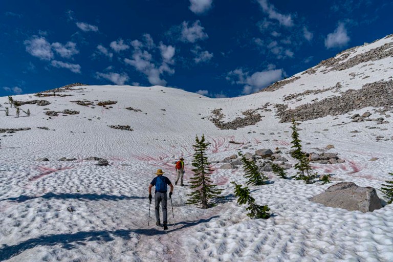 We have a saying here, don’t eat the yellow snow or the red snow! These red streaks are a form of algae and sometimes call watermelon snow. The red snow is common this time of year as the temperatures and sun warms in the high country snow packs. You can just make out the summit on the left center of the image. https://en.wikipedia.org/wiki/Watermelon_snow