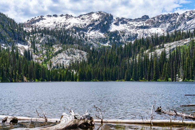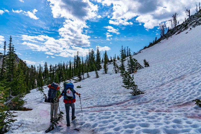 An image looking back up the other direction with a cool snag. Idler Peak is up over this ridge.