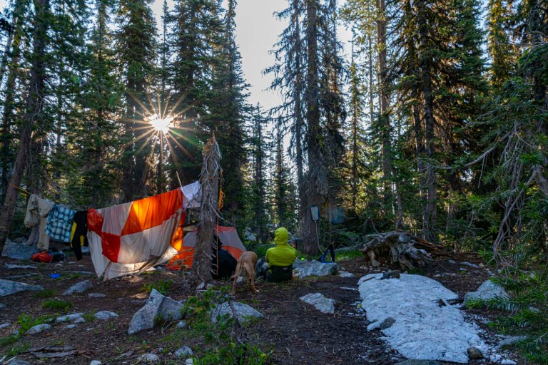 Back in camp, we were prepping to load up and start our 10 mile hike back to the car. A couple things to note, first, our tent fly is hanging on the line to dry before packing, it is relatively cold and the sun is filtering through the trees so we are huddled up drinking coffee and eating breakfast. Finally, yes, this is the first week of July and that is a snow bank in our camp! We referred to the snow as our refrigerator. It was nice to keep some of our food supplies cool and convenient to our outdoor kitchen!!!