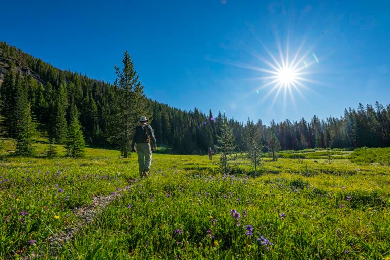 In order to get to our ridge, we need to cross this lush high valley floor then head up the ridge to the left.