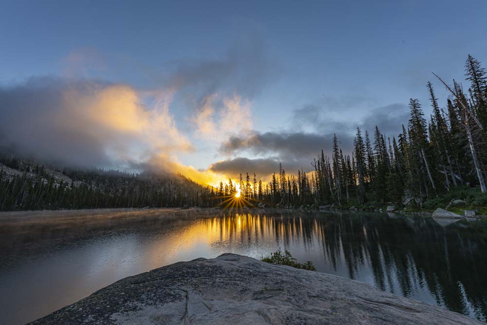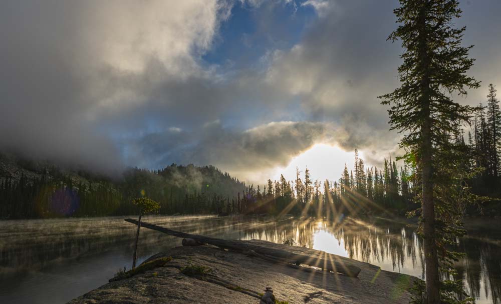 I love this image with a double sun star burst and the rays filtered through the trees reflected on the lake steam!