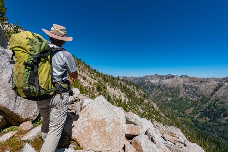 As predicted, we were soon on our way, looking back at Marge Lake and Rain Peak. Just a quick note here, often times we find a tree growing out of a rock like this one. John and I refer to these as “Rich” trees. Named after our friend Rich who is one of the toughest guys I know but has a big soft heart for trees growing out of rocks and 3 leg dogs!