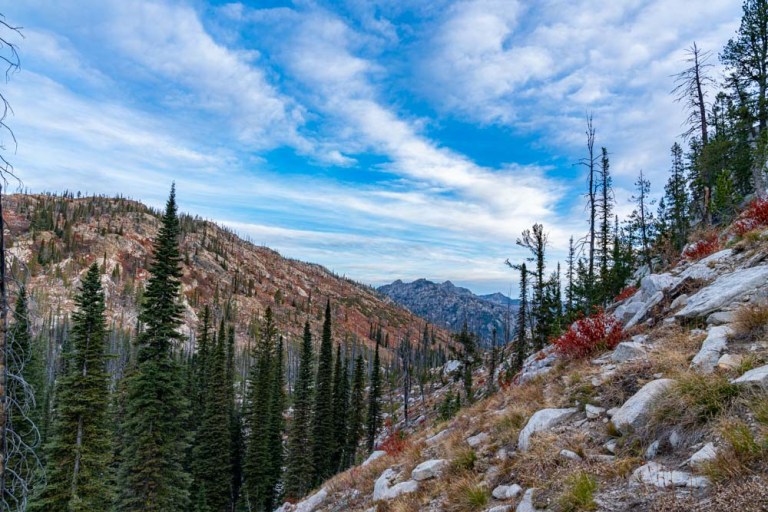 This image looks up the Lake Fork Creek drainage with Hum Saddle in the distance and Lick Creek Saddle in front of it.