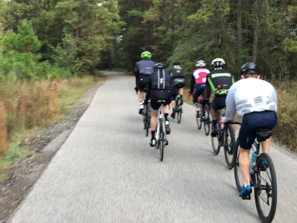 We decided to head down to a route we almost never ride, The Spring Creek Trail. It was early Thanksgiving morning so we figured most people would not be out yet. We were not disappointed and had the trial all to ourselves! After a couple miles of brisk riding, we encounter a policeman blocking the trail exclaiming it was closed for the holiday. Without realizing it, we had crossed into Harris County, the county home of Houston. The COVID rules are much stricter here and they had closed all the parks. We were breaking the law! After a quick photo, with the cop by the way, we flipped it around and headed back to the much more recreation friendly grounds of our home, Montgomery County.