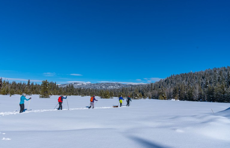 It’s time for what has become our annual trip to Cruickshank Reservoir. Tom, John, Bird, Craig, Susan, Ruby, Dakota and I headed out on this bluebird day. It’s a hike that Tom and Susan do frequently since it starts in their back yard. Here is last year’s post, notice how different the conditions were. https://davefaitlemonde.com/2020/02/10/cruickshank-reservoir-valley-county-idaho/