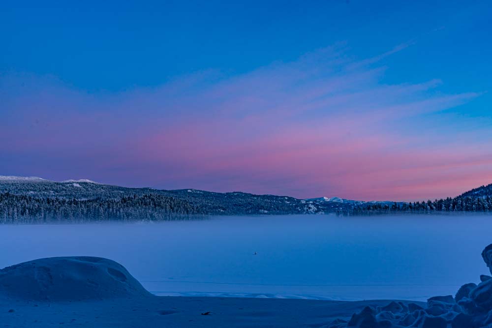 Another amazing morning in McCall! This particular morning was cold! About 0 degrees! A light thin mist on the lake and pink skies!