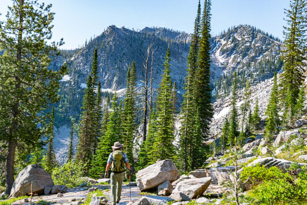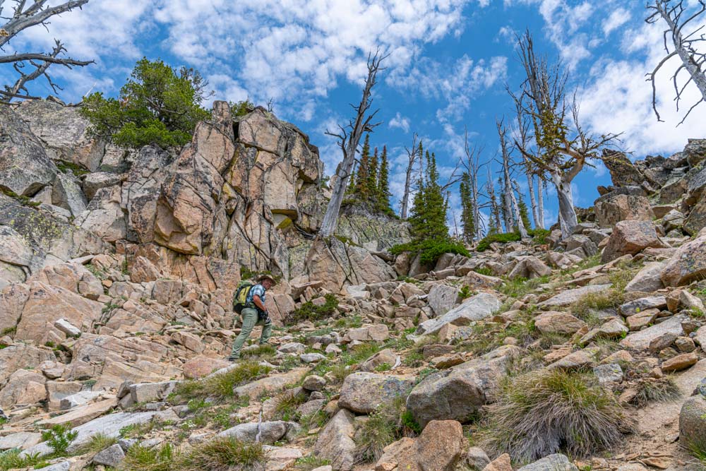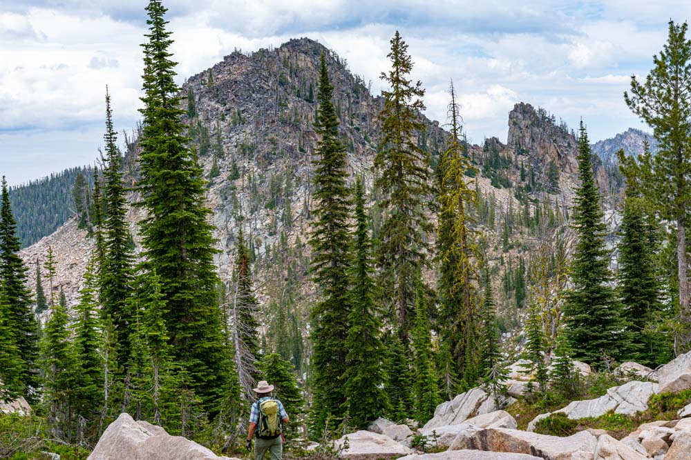 John hiking toward Cly Lakes, the lake sits in the notch just to the left of John.