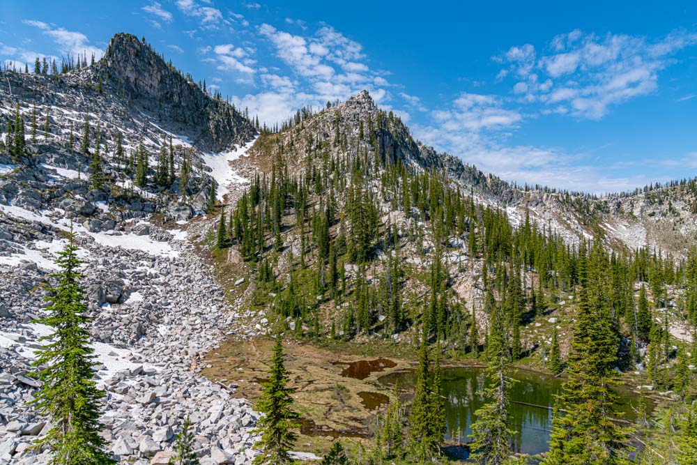 A shot of Cly Lake #3 (its one of 5 lakes in the basin) looking toward the outlet. The peak in the notch is Paintbrush Peak.