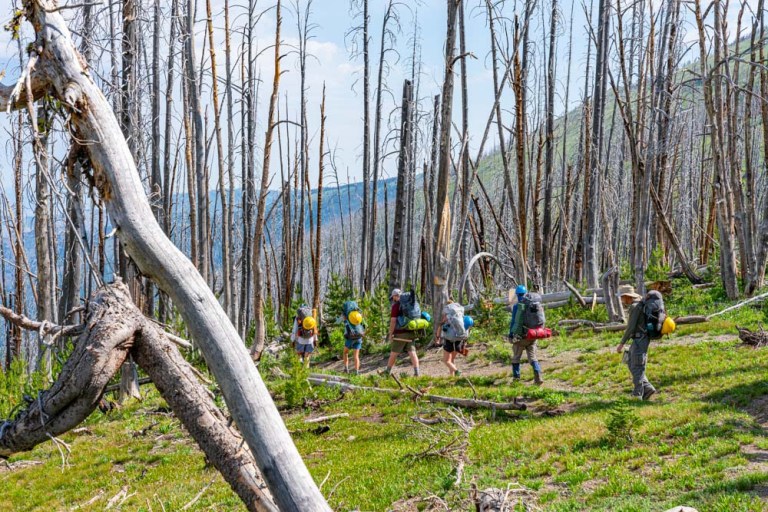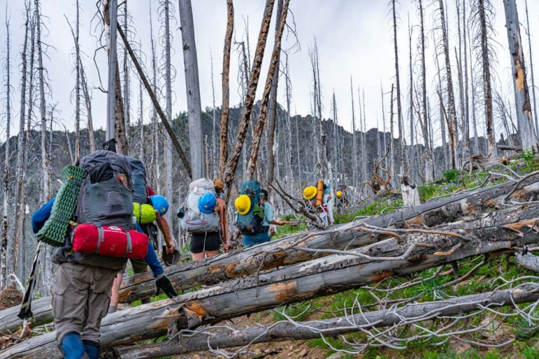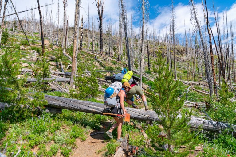 After arriving at the Windy Saddle Trailhead last Wednesday mid morning, we were soon off with our full packs and tools. Judging by the standing dead trees and the reports of much downfall, we had a feeling our work was cut out for us….. so to speak.
