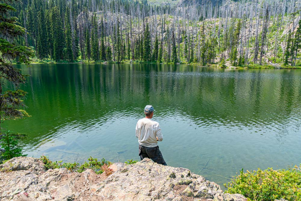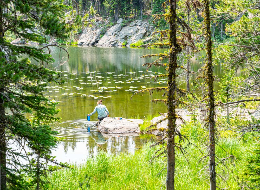 At the first lake, Jenny filters water to fill her bottles, something we need to do regularly along the route. It minimizes the about of water we need to carry.
