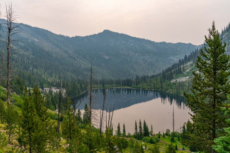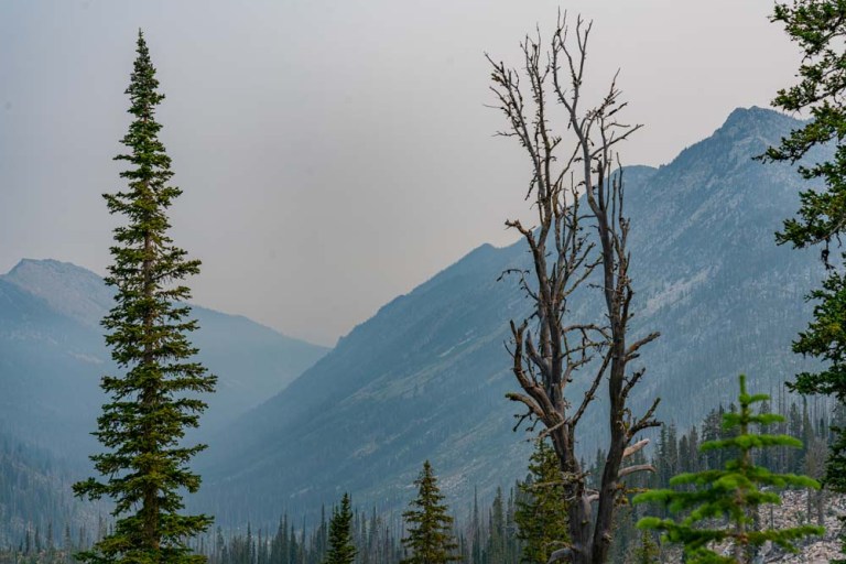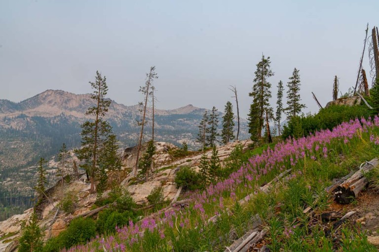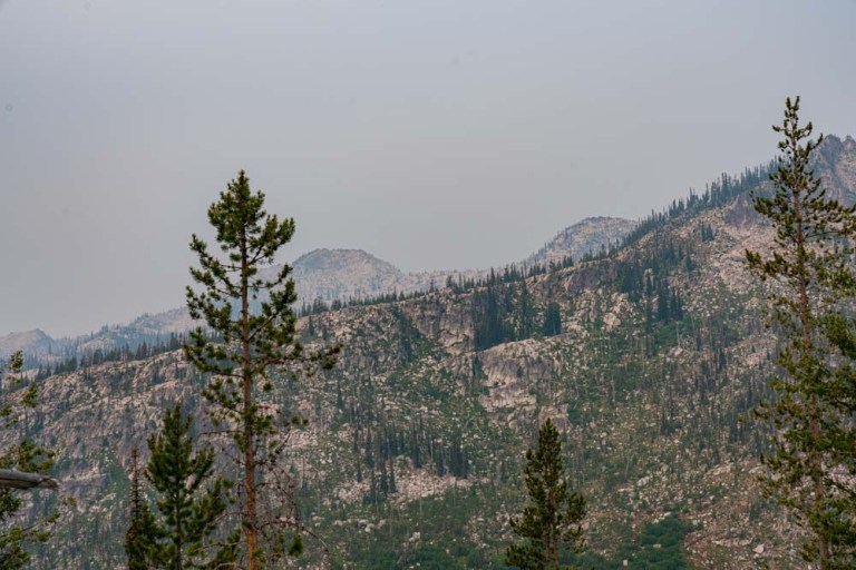 On top of the second climb, lots of smoke and views down Loon Creek. On the right, South Loon Peak.