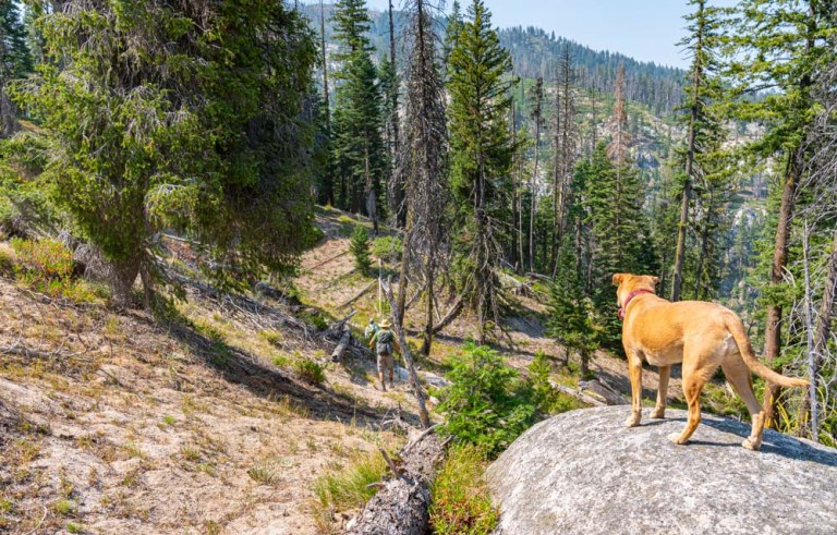 At the top of the first climb is Hum Saddle. Ruby poses as we look down Hum Ridge which contains several promenade peaks, the nearest of which I climbed in 2019. This spot always reminds me of my daughter Nicole as it is one of her favorite spots in the world! A quick check of my phone showed I had some cell coverage. I sent a text and was soon doing a FaceTime conversation with her!