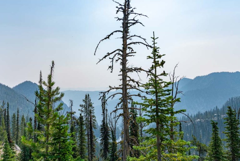 After a goodly climb up No Trail trail, we were looking down on the first Blackmare Lake….you can just make it out in the trees. Yes, looking down Blackmare Creek towards the west, it is smokey!