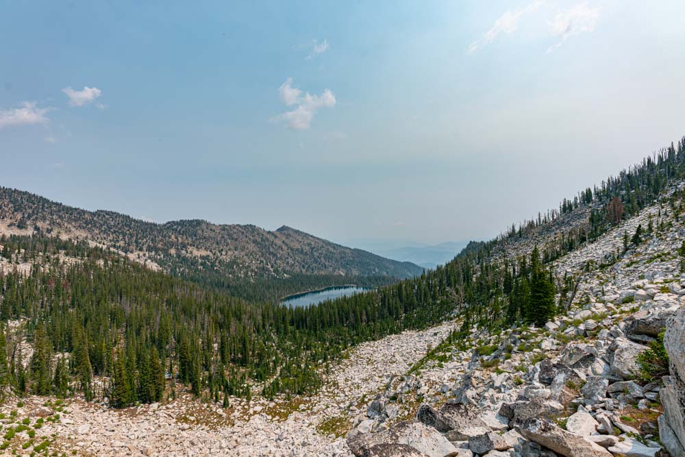 After about 4 hours of full packing, we are on the ridge looking down at Nick Lake, our destination for the evening.