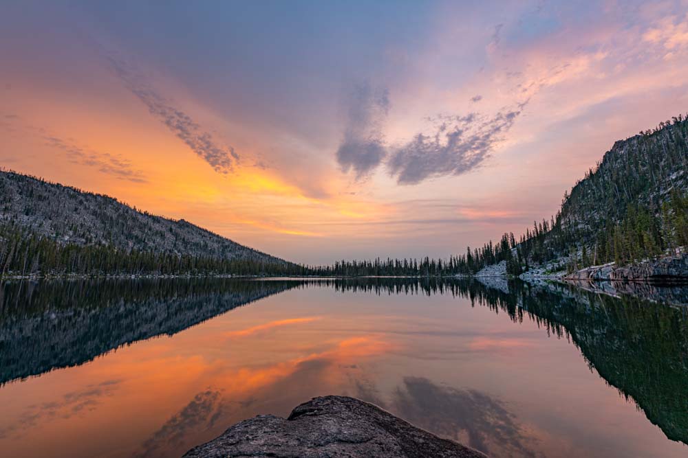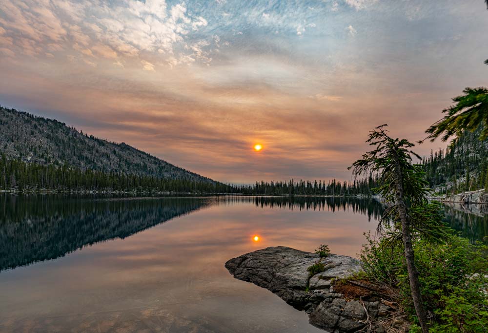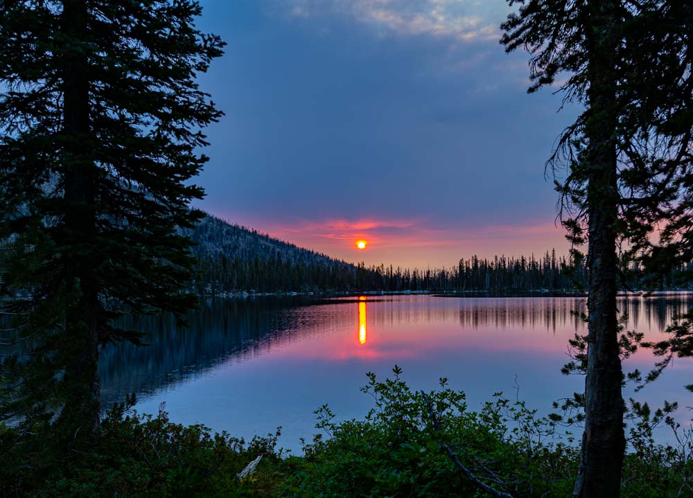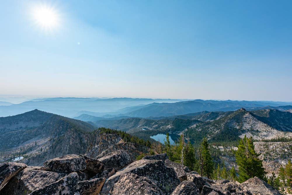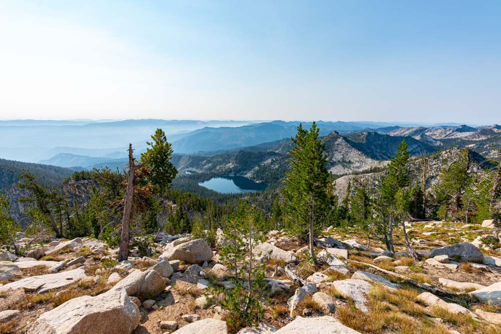 At the summit, looking back towards Nick Lake. If you look carefully, you can see both the Lower and Upper Nick Lakes as well. In the distance, Southfork of the Salmon River and smoke from the Dixie Fire.