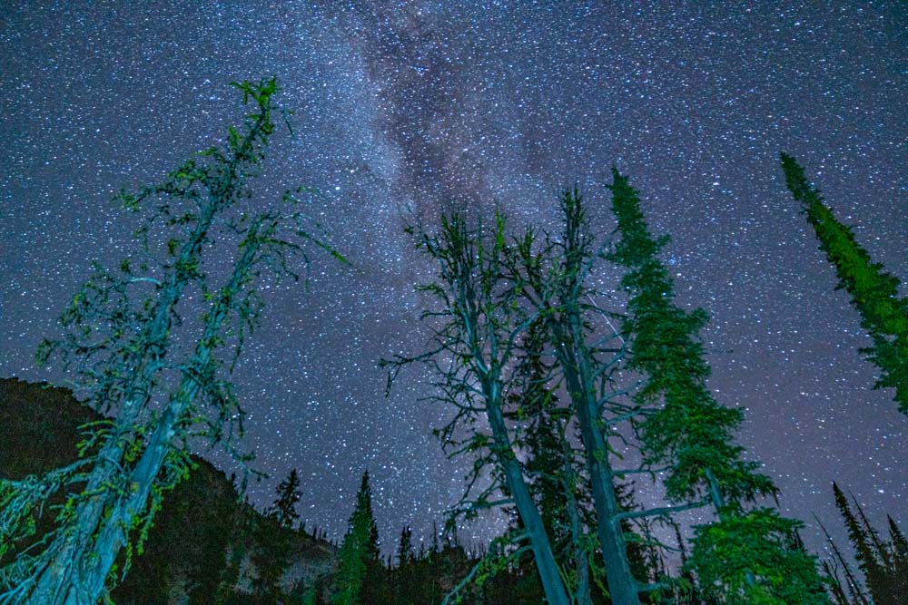 After maneuvering in the area around camp, I was able to shoot the Milky Way through the trees. Middle Fork Lake and our camp sits in a bit of a hole which makes good galaxy photography a bit of a challenge.