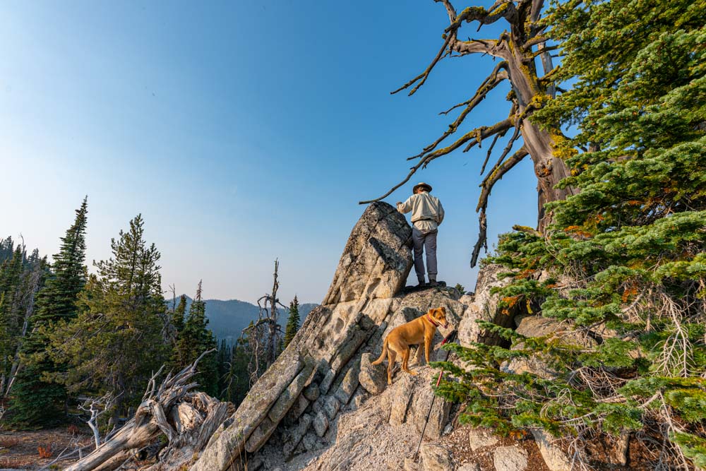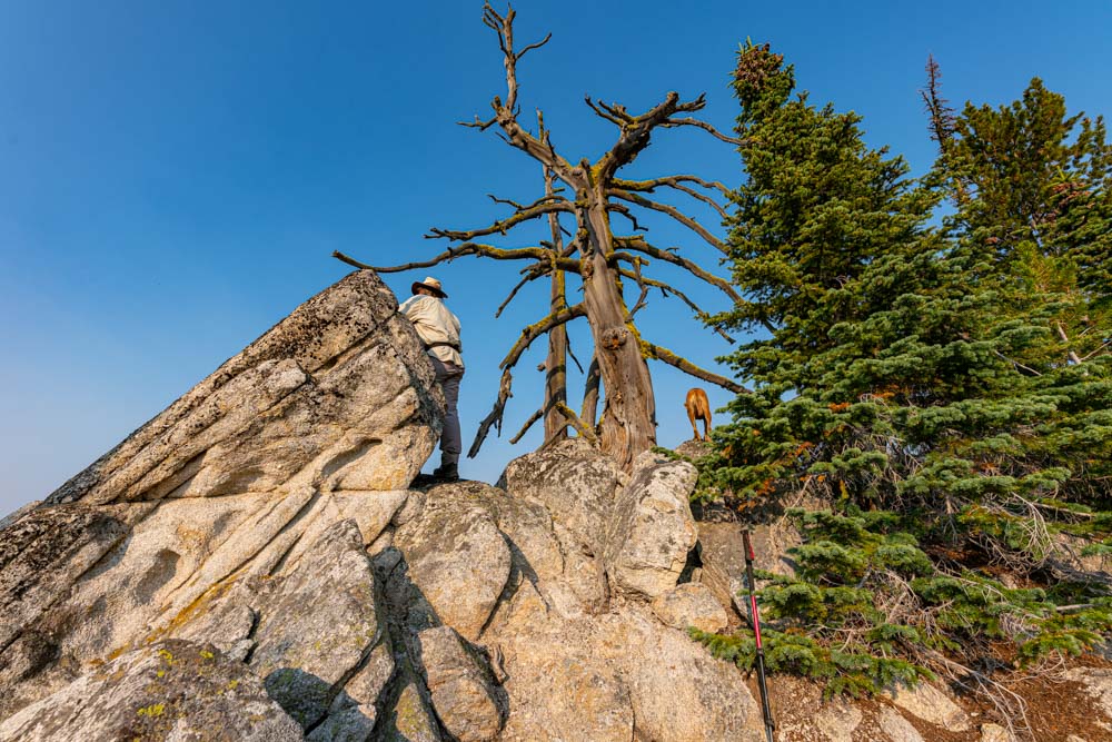 Back at the top of the ridge and also the highest part of our day, John, Ruby, and I spied a small high point with a cool rock and dead snag.