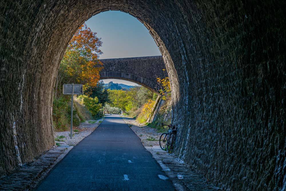 I passed under the rail to trail, tagged the end of the D181, then came back and rode the trail to Hippolyte-du-Fort…..my out and back just became a lolly pop. I took no additional photos of the rail to trail other than this super cool view as you emerge from the tunnel.