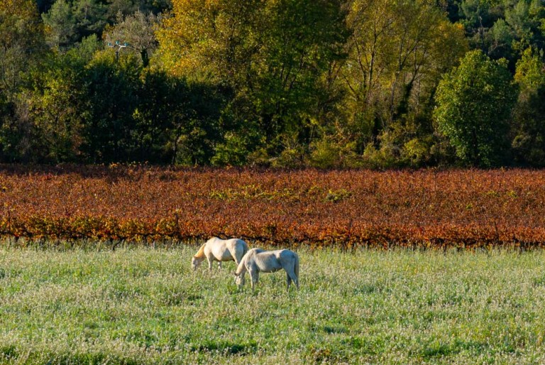 Same two horses, notice the grape vines in the background have lost all their leaves.