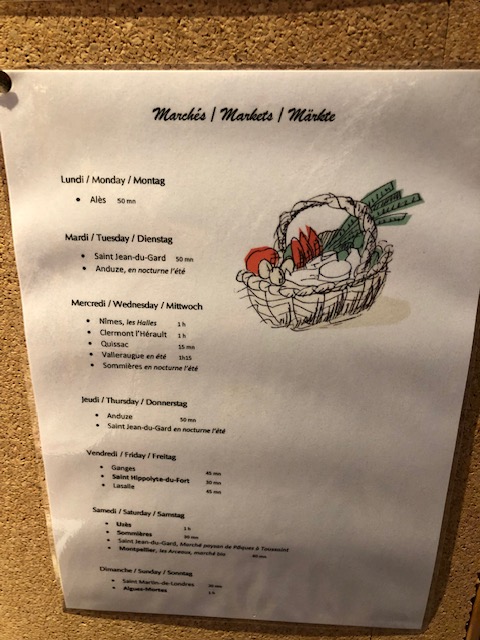 One of the things I love about Europe…. you might even say the rest of the world, are the farmers markets. Here is a list of the market locations in the area and the days of the week they occur. Its essentially the same market that moves around from town to town. Many times I plan my daily ride to swing through the daily market.