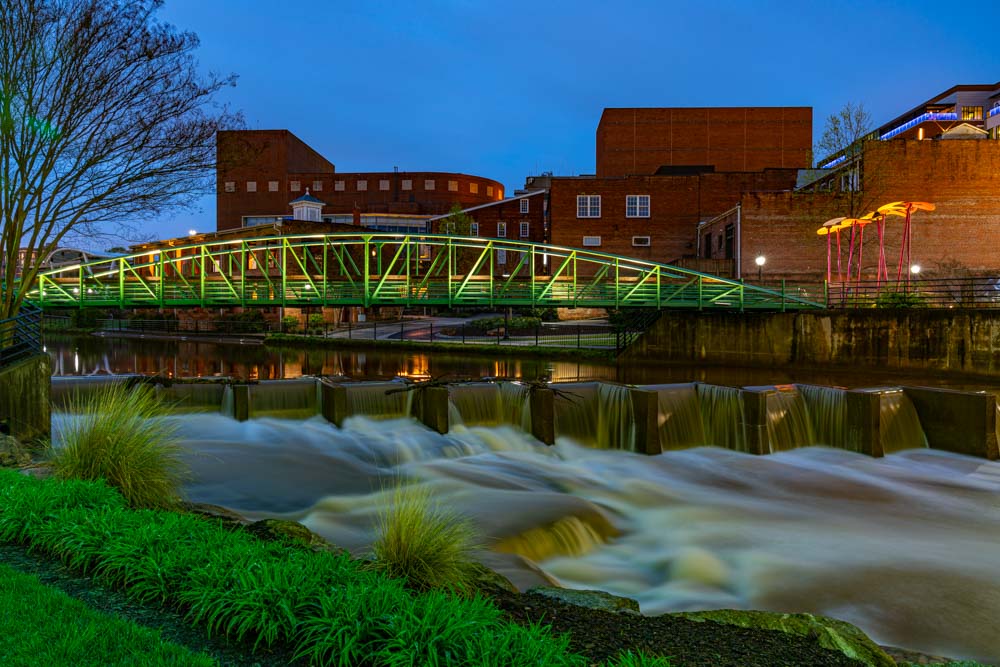 I ended March with a ride camp in Greenville, South Carolina. While there I got out in the evenings and mornings for some low light photography. This is the Reedy River downtown after a good solid day of rain.