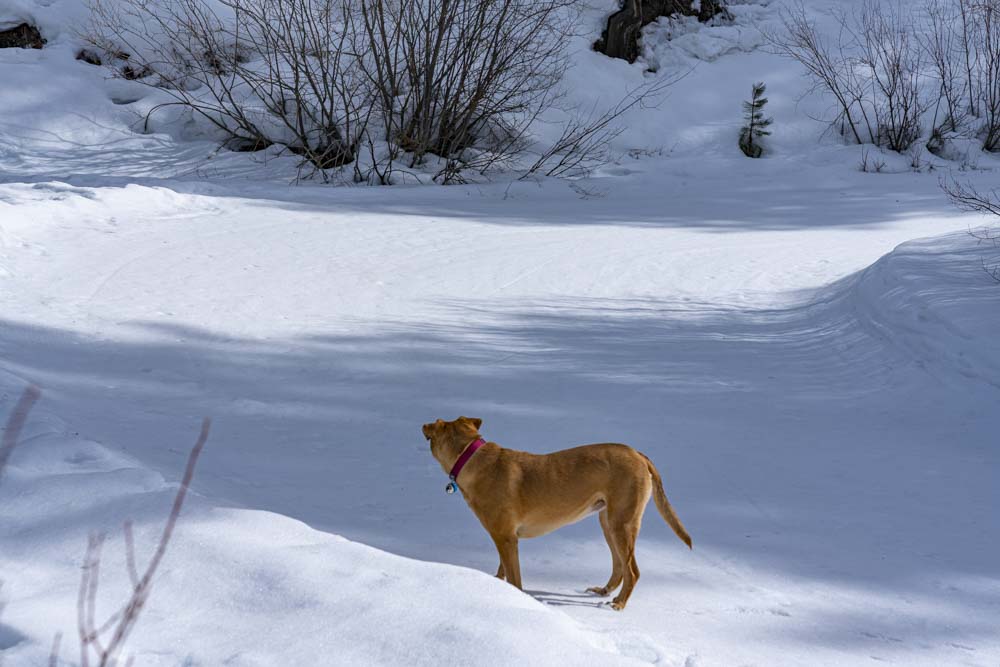 Back down we go! Anytime we short cut off the groomed trails, the snow was quite punchy and soft. Ruby knows to walk in the snowshoe tracks to prevent punching through to her chest.