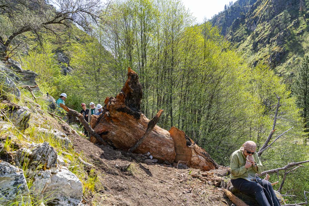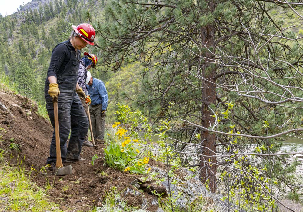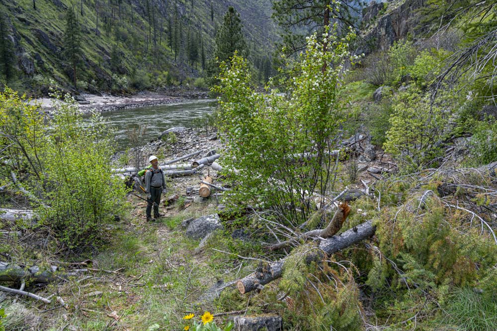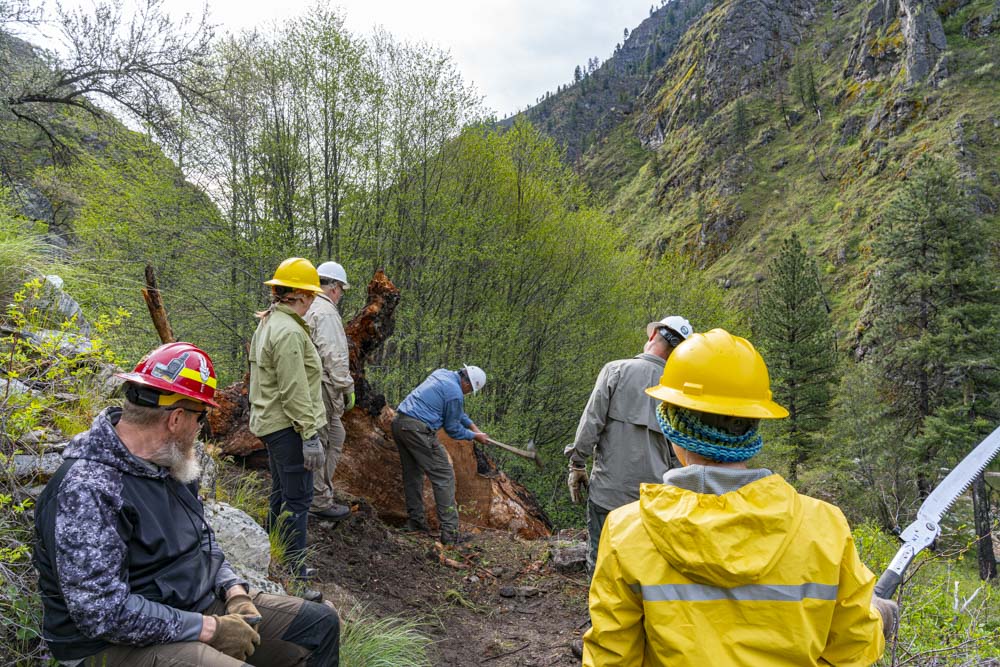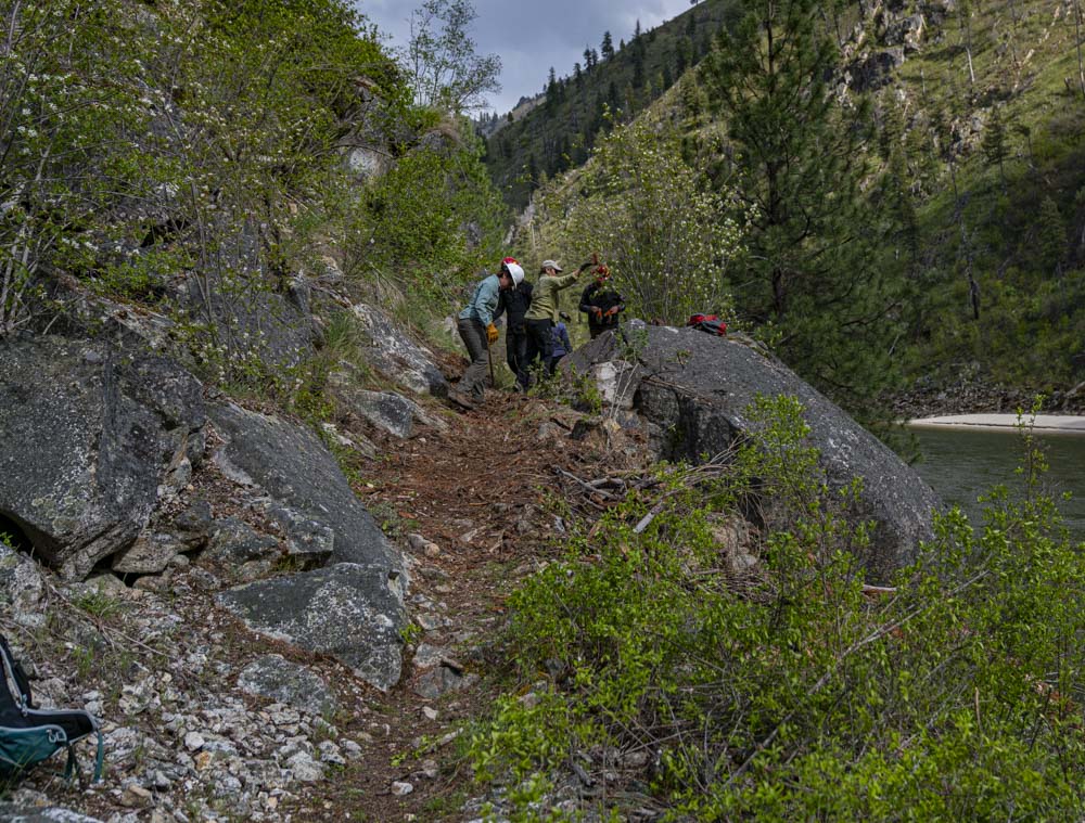 Today I was part of a team that rode a jet boat shuttle about 6 miles up river. We dubbed this team the “Boat People”. From left to right, Tom, Kelly, Lilly, Leslie, Joe, Tim, Amber, and Phil. Other teams went up the mountain to work the Sheep Creek and Johnson Saddle Trails.