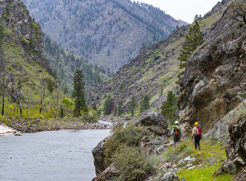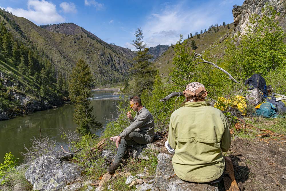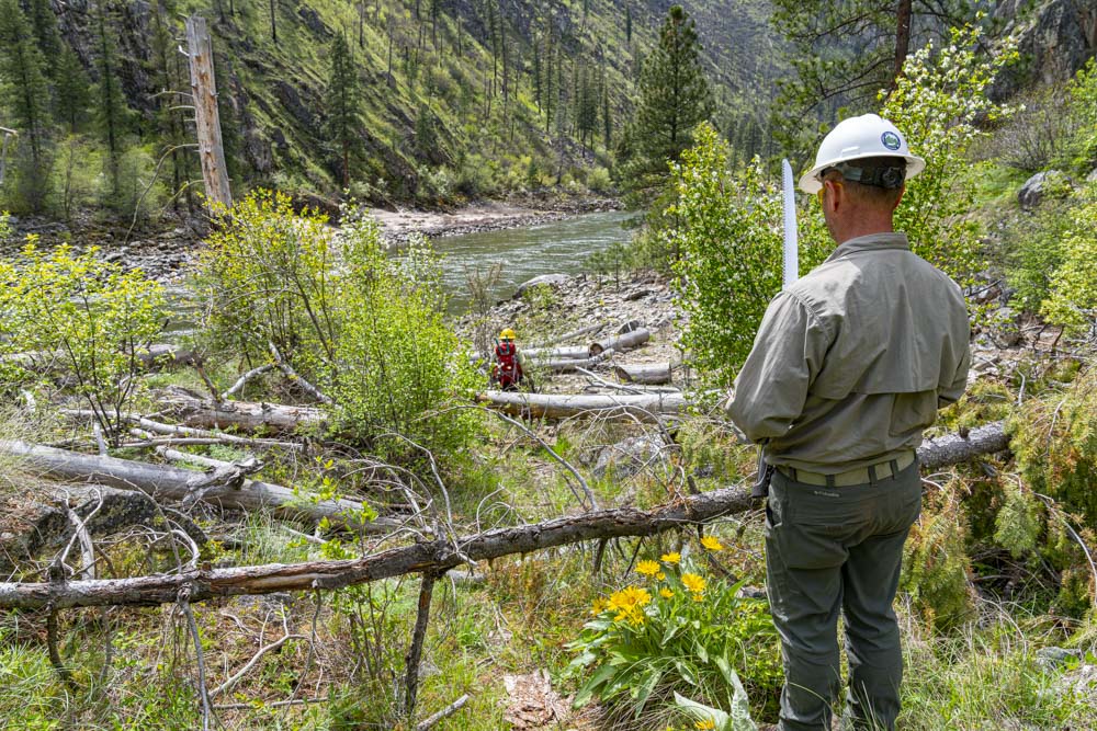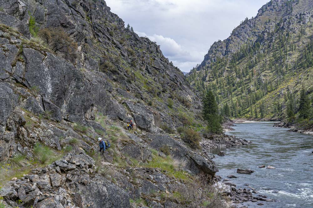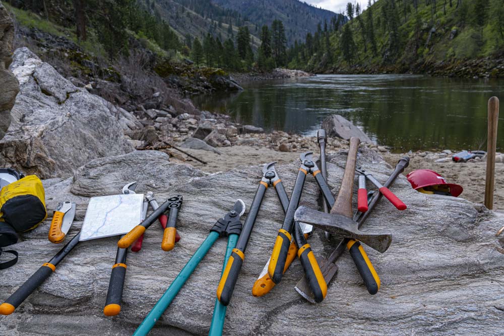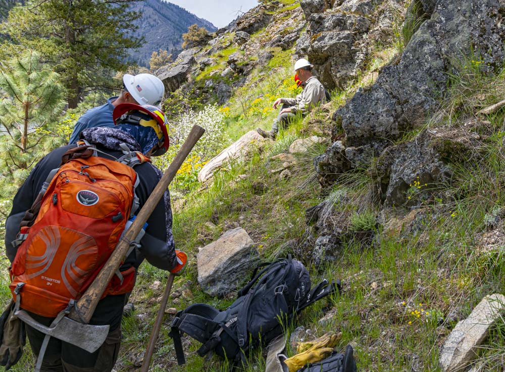 Today I was part of a team that rode a jet boat shuttle about 6 miles up river. We dubbed this team the “Boat People”. From left to right, Tom, Kelly, Lilly, Leslie, Joe, Tim, Amber, and Phil. Other teams went up the mountain to work the Sheep Creek and Johnson Saddle Trails.