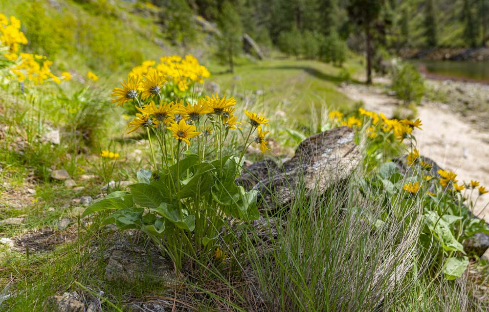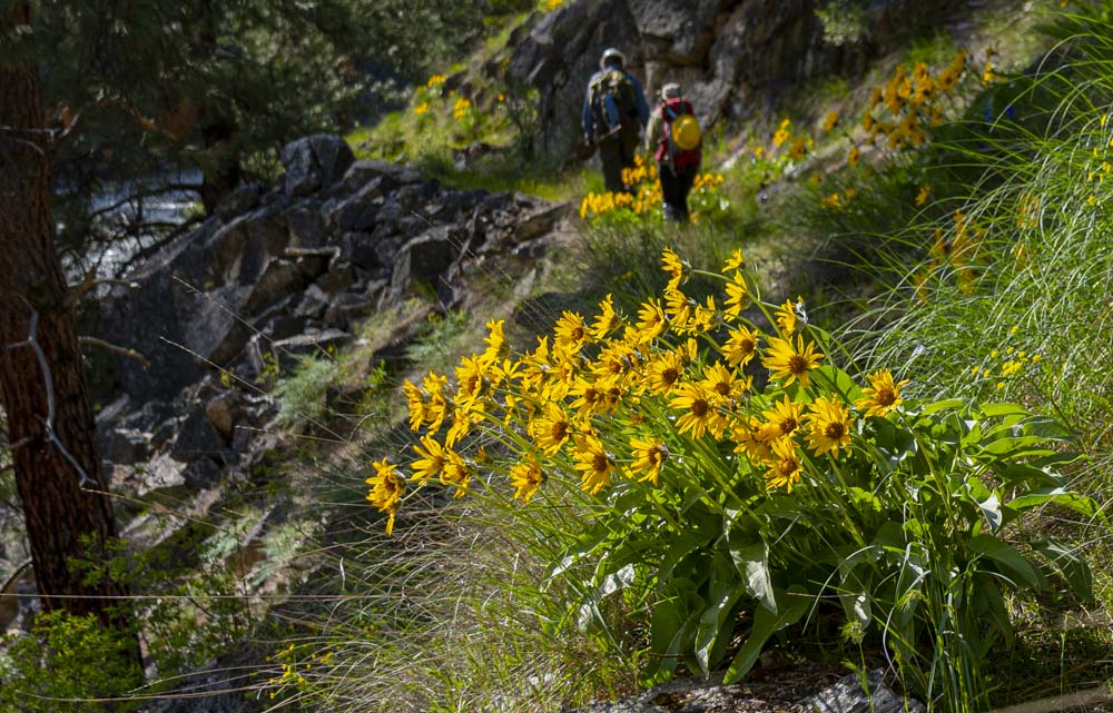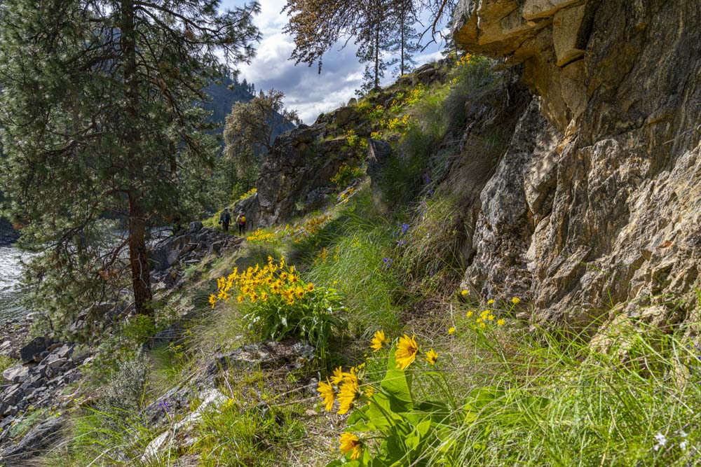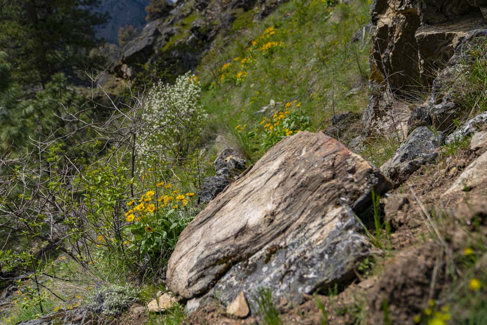 This rock was in the trail so we deployed our leg push method to remove the obstacle. Joe and Amber were in place to push and I asked them not to crush the flowers just below the rock.