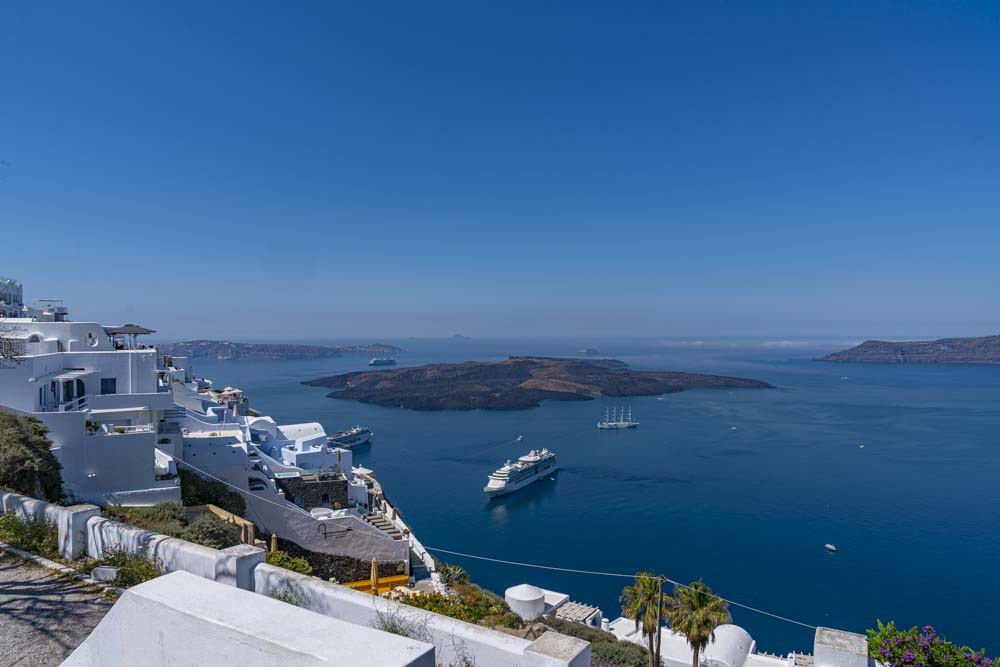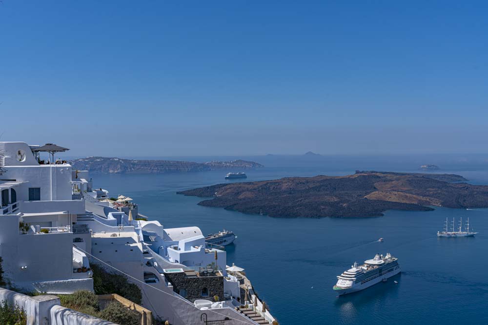 A shuttle ride to the top of the Caldera and we had amazing views. A Caldera is the inside of a volcano which has blown its top. We were on the top of a ring island which was once the side of the volcano. In the middle, on the other side of the cruise ship is a new lava dome building.
