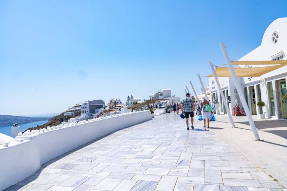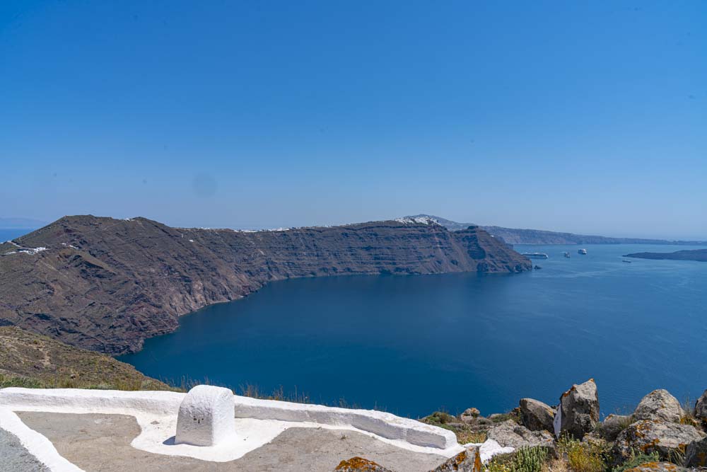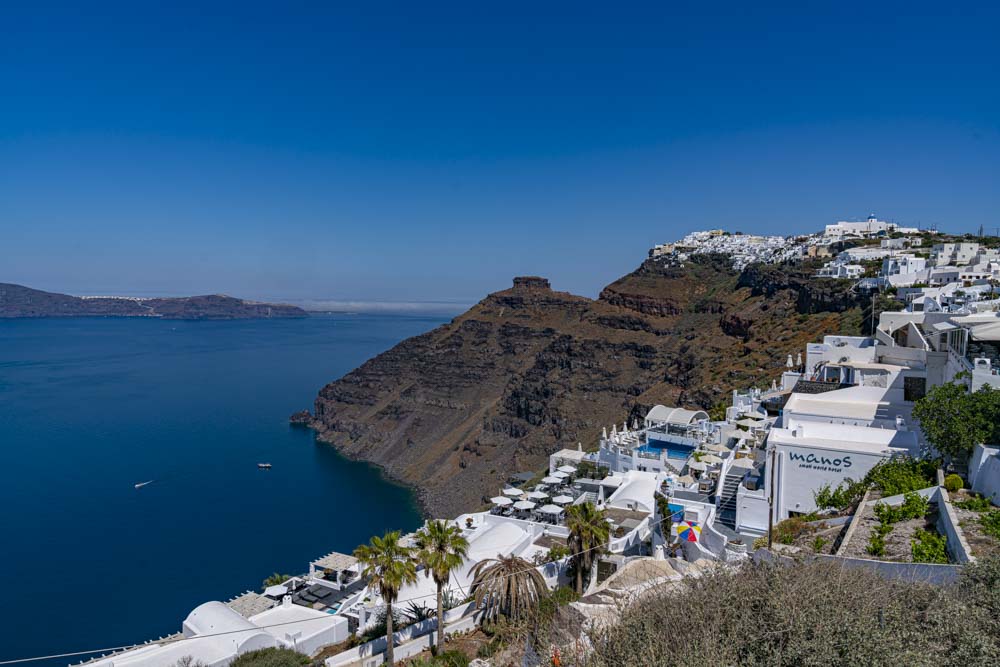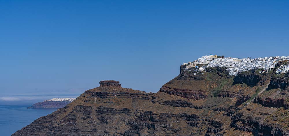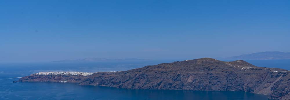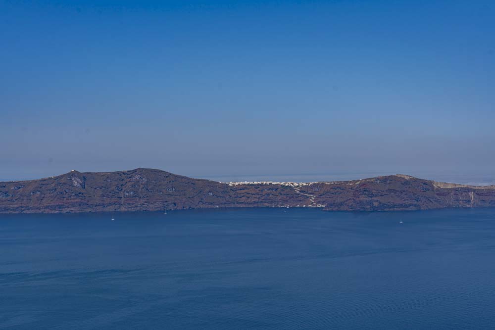 Off in the distance, the island of Theirasia, the other side of the Caldera. More on Teirasia in the next blog as we will visit this island. The snow caped saddle is actually the village on the island and the white zig zag down we will learn tomorrow is a walkway to the port.