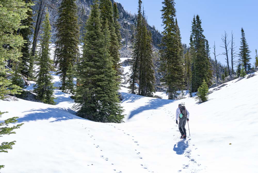At Golden Lake, some melting had occurred but with today’s cold morning, it had re-frozen. Our snow pack today was very firm…. Without crampons it made for a few pucker moments early on.