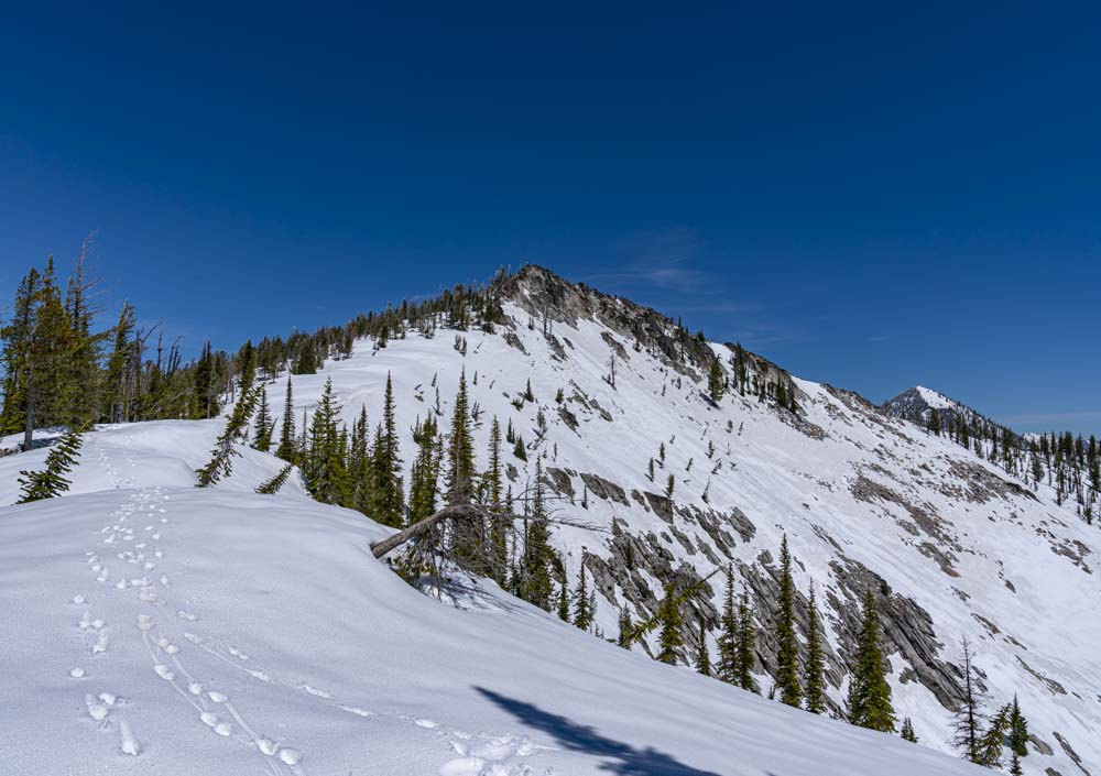 A little bit later it was the first clear view of our objective for the day, Snowslide Peak. Off the right shoulder is Sawtooth Peak which we hope to get to later this summer. As you can see from the tracks, Ruby and Dakota knew what we were doing. Below the summit you might get an idea of how this peak got its name.