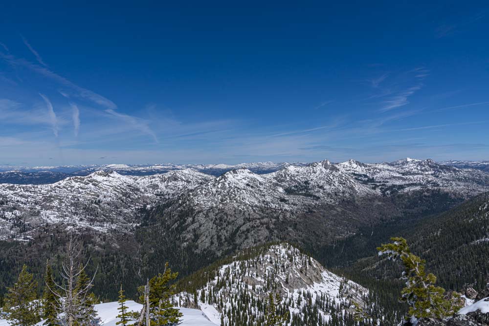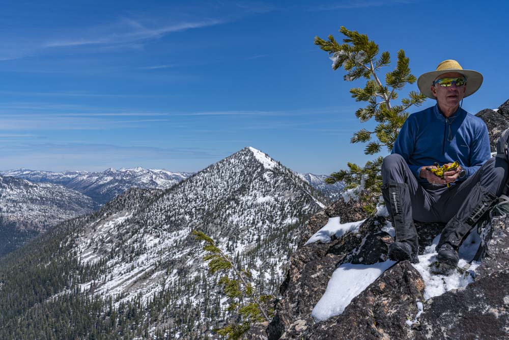 Sitting near the summit block, it was time for lunch, Sawtooth peak sits just behind Tom and other peaks stretch as far as the eye can see.