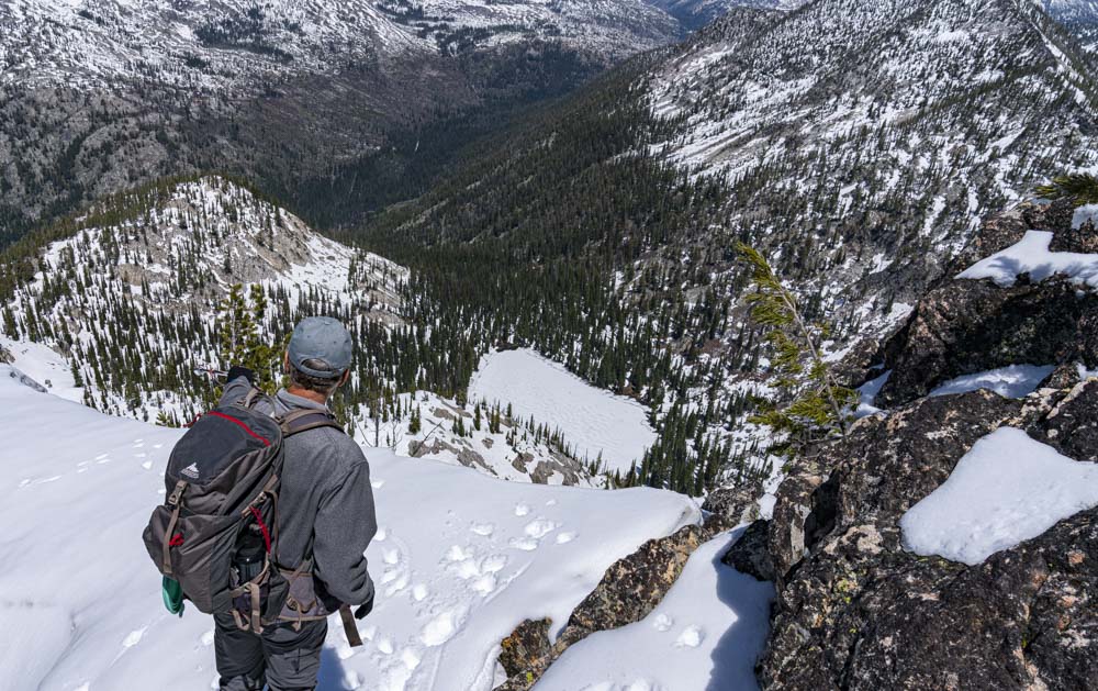 Craig carefully peeks over the edge and looks down on Snowslide Lake….. not going to be fly fishing there for a while!